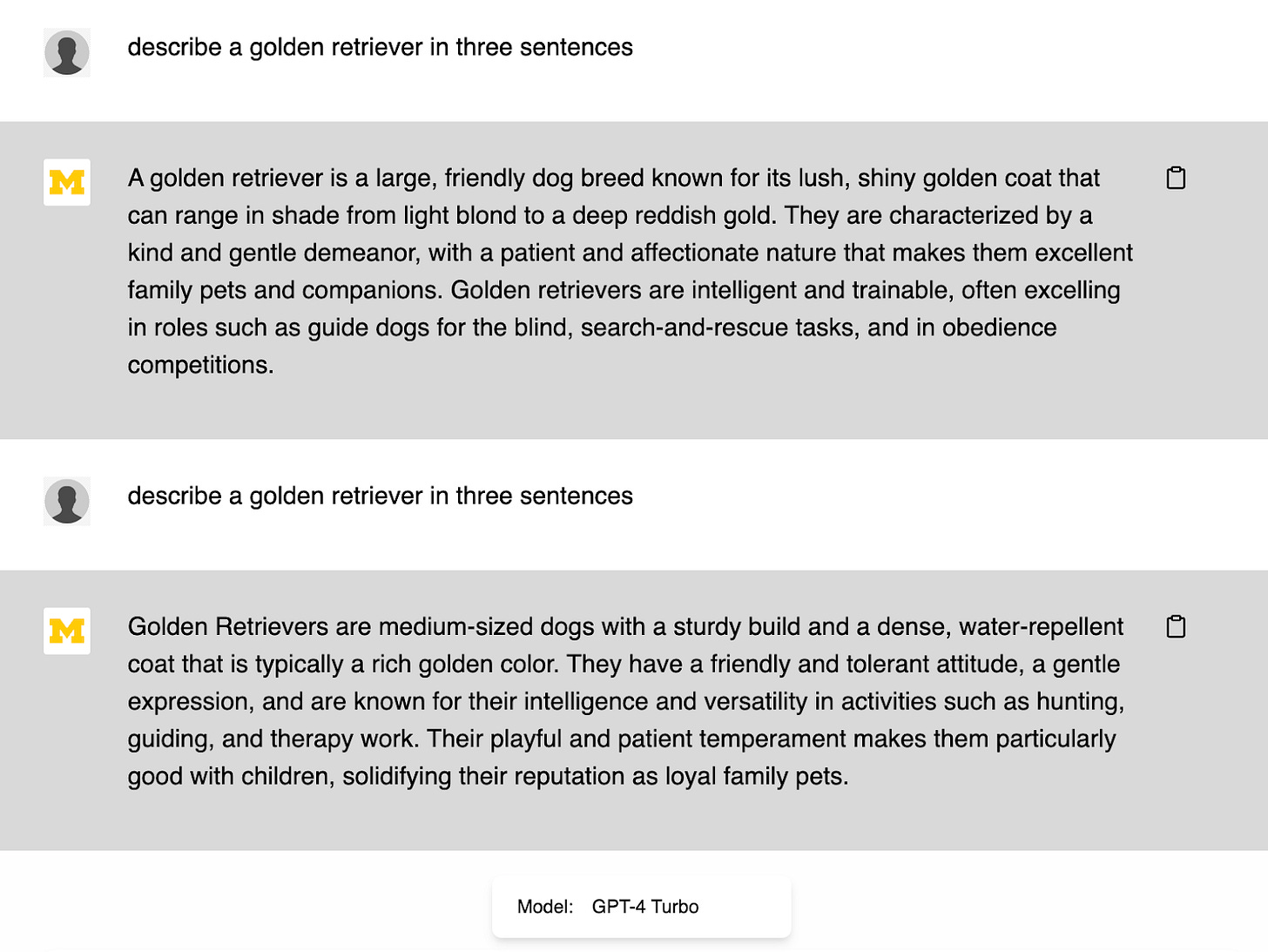 To illustrate, here are two responses to the identical prompts, generated back to back, by the University of Michigan’s U-M GPT (based on OpenAI’s GPT4-turbo model):